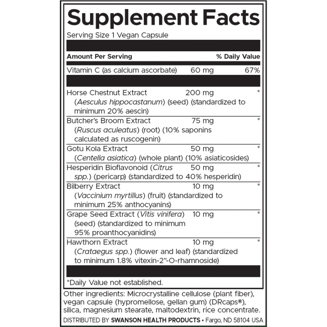 Сега е време да се изправите на крака! Специалната формула на Суонсън за здравето на вените на краката съдържа изключително ценни билки, сред които миши чимшир, боровинка и глог, които подпомагат циркулацията в краката. А конският кестен и готу колата подобряват здравето на вените и капилярите. Включили сме освен това и екстракт от гроздови семки, който защитава колагена, необходим за здравето на артериите, както и биофлавоноида хесперидин, който повишава защитните функции на тялото.