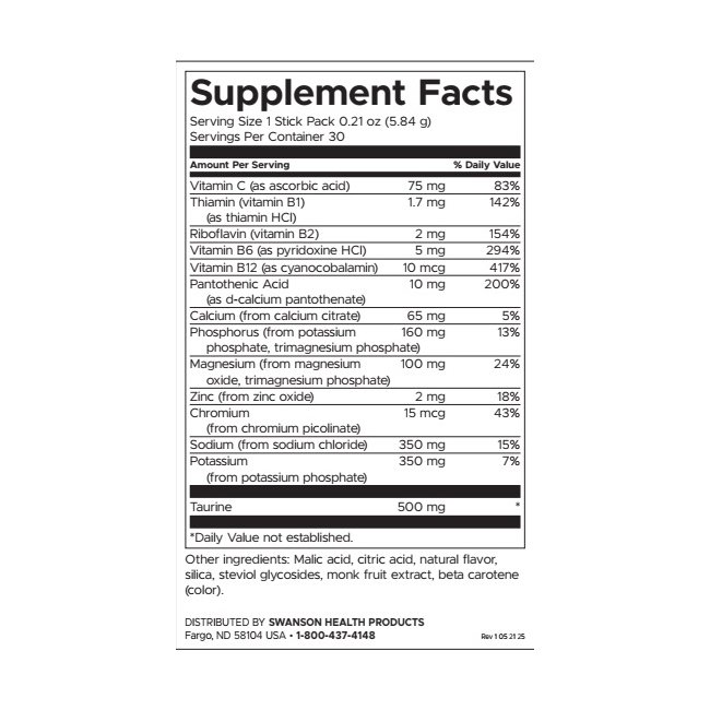 Освежете се с електролитната хидратираща смес с вкус на диня от Суонсън! Предлага се в удобни опаковки за лесна хидратация в движение. Всяка доза съдържа 75 mg витамин C за здравето на имунната система и 10 mcg витамин B12 за повишаване на енергията. Идеална формула, която поддържа електролитния баланс и която е особено подходяща за спортуващите, както и за хората, които водят активен начин на живот. Не съдържа глутен и предоставя с всяка доза 500 mg Таурин - аминокиселина, която насърчава мускулната функция и намалява мускулните крампи, които често се получават при физическо натоварване.