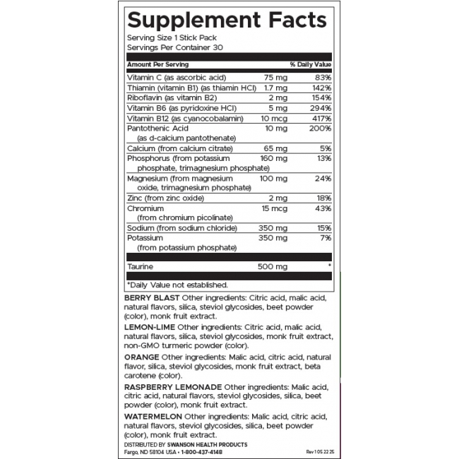Хидратиращата електролитна смес микс на Суонсън ви помага да поддържате електролитния си баланс за оптимална хидратация по вълнуващ начин, като предлага пет различни вкуса: лайм, горски плодове, портокал, диня и малинова лимонада. Всяка доза съдържа 75 mg витамин C за подкрепа на имунната система и 10 μg витамин B12 за по-високи нива на енергията по всяко време. Сашетата не съдържат глутен и са перфектни за всички, които тренират и водят активен начин на живот. Добавените 500 mg от аминокиселината таурин в доза насърчават мускулната функция и предотвратяват образуването на крампи.