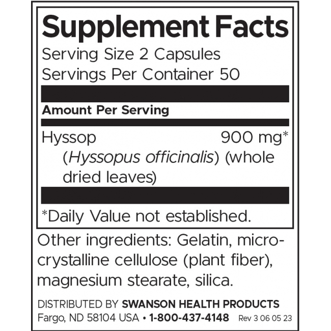 Вечнозелена многогодишна билка, вирееща в Южна Европа и Централна Азия, исопът на Суонсън е пълен с ползи за цялото тяло. Освен че благоприятства цялостното здраве, билката исоп допринася за нормалната функция на храносмилателната система. Всяка доза от две капсули съдържа 900 мг исоп на прах.